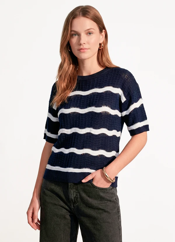 Blusa Azul Marinho Tricô, perfeita para um look moderno e confortável. Com decote redondo e mangas curtas, seu design exclusivo de listras onduladas em branco adiciona charme. Ideal para o dia a dia, oferece versatilidade e toque macio. Adicione estilo ao seu guarda-roupa!