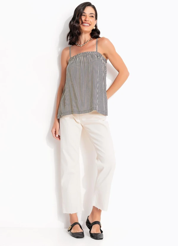 Blusa de alças finas com estampa em listras verticais marinho. Modelagem solta e fluida, com elástico no busto que proporciona ajuste confortável. Ideal para compor looks frescos, modernos e despojados nos dias mais quentes.