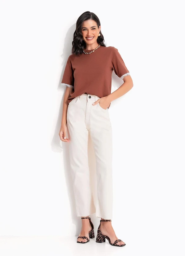 Blusa marrom em malha de algodão, peça perfeita para um look confortável e elegante, apresenta um delicado detalhe de renda chantilly nas mangas, adicionando um toque romântico e sofisticado. Ideal para diversas ocasiões, do trabalho ao lazer.