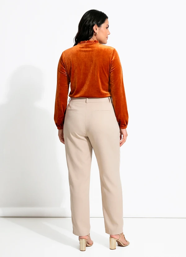 Blusa terracota em veludo de poliéster, com decote V e gola franzida que adiciona charme ao visual. Possui mangas longas com punhos e fechamento por botão. De toque macio e brilho sofisticado, é perfeita para compor looks de trabalho ou eventos casuais com elegância e conforto atemporal.