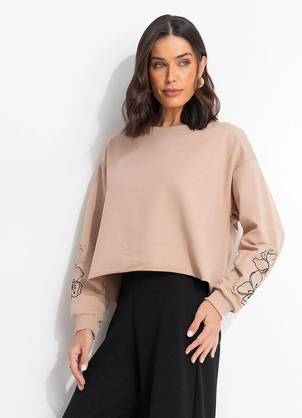 Casaco bege de modelagem solta em moletinho. O bordado floral nas mangas confere um charme único e sofisticado, oferece conforto para o dia a dia, ideal para compor looks casuais cheios de estilo. Esta peça é um must-have para quem busca conforto e originalidade.