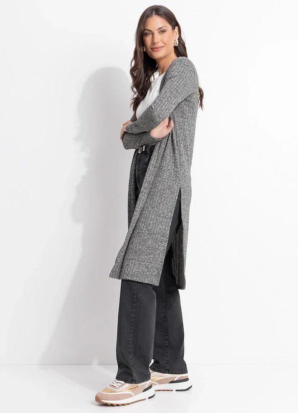 Quintess - Cardigan Alongado Grafite em Malha Tricô Canelada com Fendas Laterais