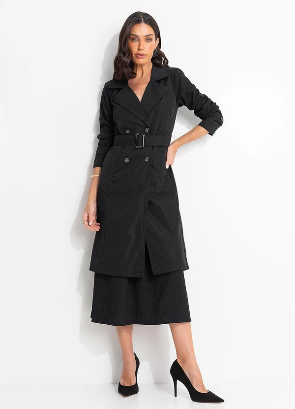 O Sobretudo Trench coat em tecido de alfaiataria sarjado na cor preta, com lapelas clássicas, fechamento transpassado e cinto com fivela para ajuste da cintura. Possui mangas longas com detalhe nos punhos martigale, bolsos laterais e caimento estruturado que garante elegância e versatilidade. Ideal para compor looks modernos e atemporais, é perfeito para sobreposições estilosas em diversas ocasiões, do casual ao mais sofisticado.