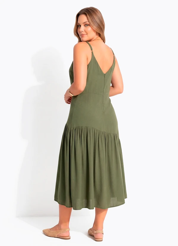 Vestido longuete em linho verde, modelagem fluida e elegante. Possui decote em V na frente e costas, alças finas reguláveis com argola em metal e recortes que criam leve assimetria abaixo do quadril. Fechamento posterior por zíper invisível. Sofisticado e moderno.