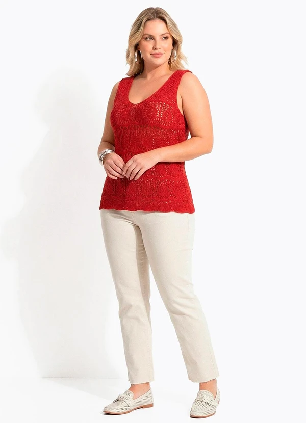 Adicione um toque vibrante ao seu estilo com nossa Blusa Vermelha em Tricô. Com decote V e textura vazada, esta peça moderna oferece conforto e sofisticação. Ideal para looks casuais ou mais elaborados, destacando-se pela cor intensa e caimento impecável. Essencial para seu guarda-roupa!