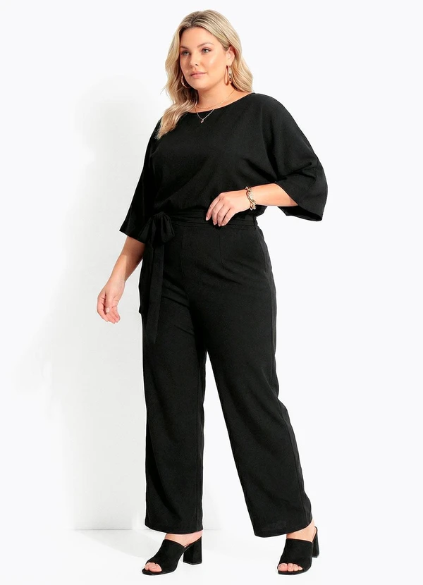 Macacão preto versátil com decote canoa e mangas 3/4, combinando elegância e conforto. Cinto de amarração na cintura valoriza a silhueta, enquanto a calça reta e fluida garante movimento. Perfeito para o trabalho ou eventos casuais chic.