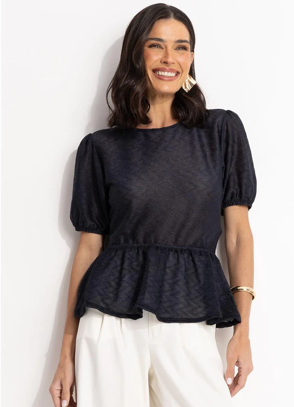 Blusa preta em malha texturizada, a peça-chave para um visual sofisticado e moderno. Com sua textura plissada exclusiva e a modelagem peplum que valoriza a silhueta, esta blusa oferece um caimento impecável. As mangas bufantes adicionam um toque de charme e elegância, perfeita para transitar do trabalho a eventos especiais com muito estilo. Conforto e versatilidade em uma única peça, ideal para quem busca um diferencial no guarda-roupa.