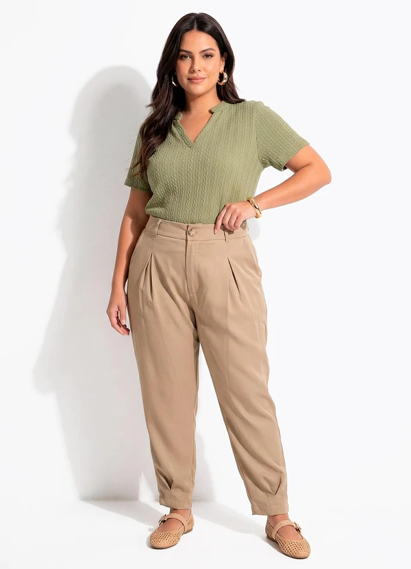 Blusa em malha tricô texturizada! Em um tom verde militar versátil, possui textura canelada discreta e decote V que valoriza. Confortável e com caimento solto, é perfeita para looks casuais ou mais arrumados. Essencial para seu guarda-roupa!