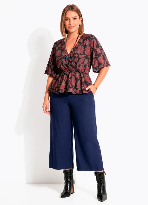 Calça pantacourt azul marinho em tecido leve de alfaiataria. Possui modelagem ampla com caimento fluido, cós reto com fechamento por zíper e botão frontal. Sofisticada e versátil, é ideal para composições modernas e elegantes.