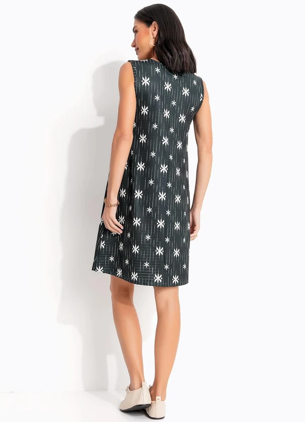 Este vestido curto é a peça perfeita para quem busca estilo e conforto. Confeccionado em malha texturizada de toque suave, apresenta uma estampa étnica abstrata em tons de verde e off white que confere um visual moderno e sofisticado. Sua modelagem soltinha e sem mangas garante liberdade de movimento, ideal para o dia a dia ou ocasiões casuais. Combine com sandálias ou tênis para um look versátil e cheio de personalidade. Adicione um toque de elegância ao seu guarda-roupa com esta peça única!