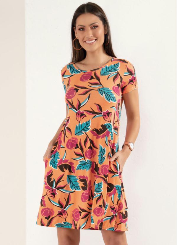 Quintess - Vestido Curto Floral Laranja com Bolsos