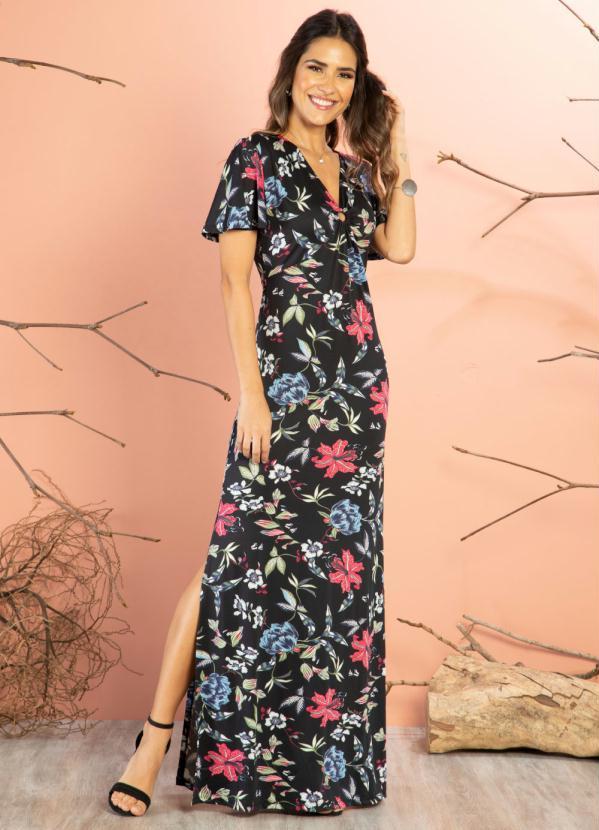 Quintess - Vestido Floral Preto com Detalhe de Argola