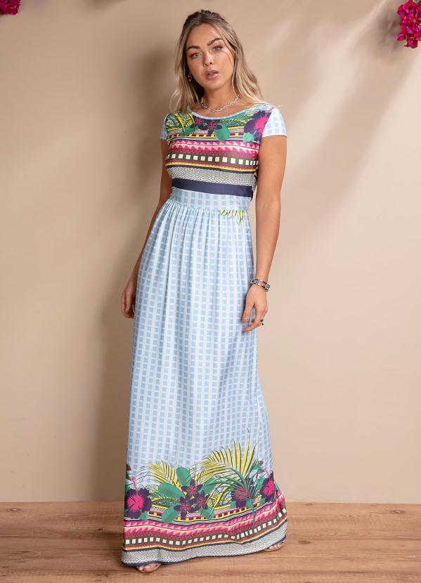 Quintess - Vestido Longo Floral Geométrico com Manguinhas