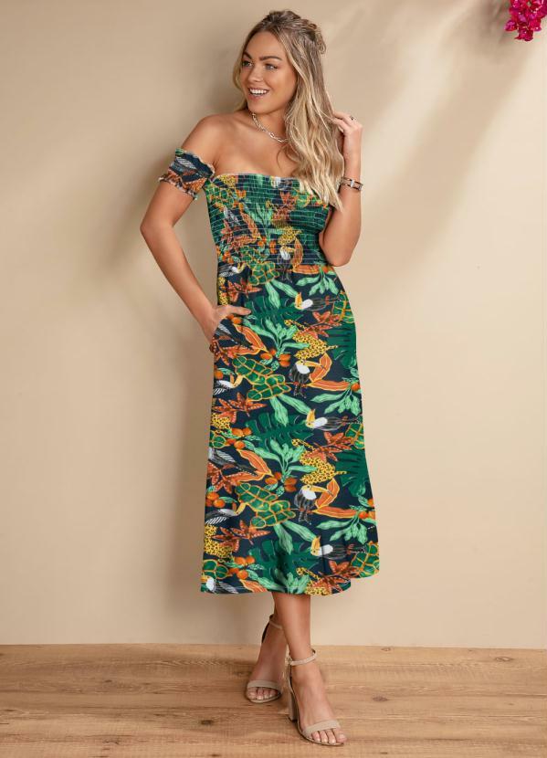 Quintess - Vestido Midi Tropical Azul Ciganinha com Bolsos