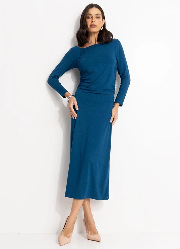 Vestido coluna em malha de viscose azul petróleo. Com modelagem ajustada e caimento perfeito, este vestido longuete apresenta cava raglan e franzidos sutis na cava e laterais, valorizando a silhueta de forma discreta. As mangas 7/8 adicionam um toque moderno e versátil. Ideal para diversas ocasiões, do trabalho ao lazer, ele promete ser a peça chave do seu guarda-roupa, combinando sofisticação e bem-estar.
