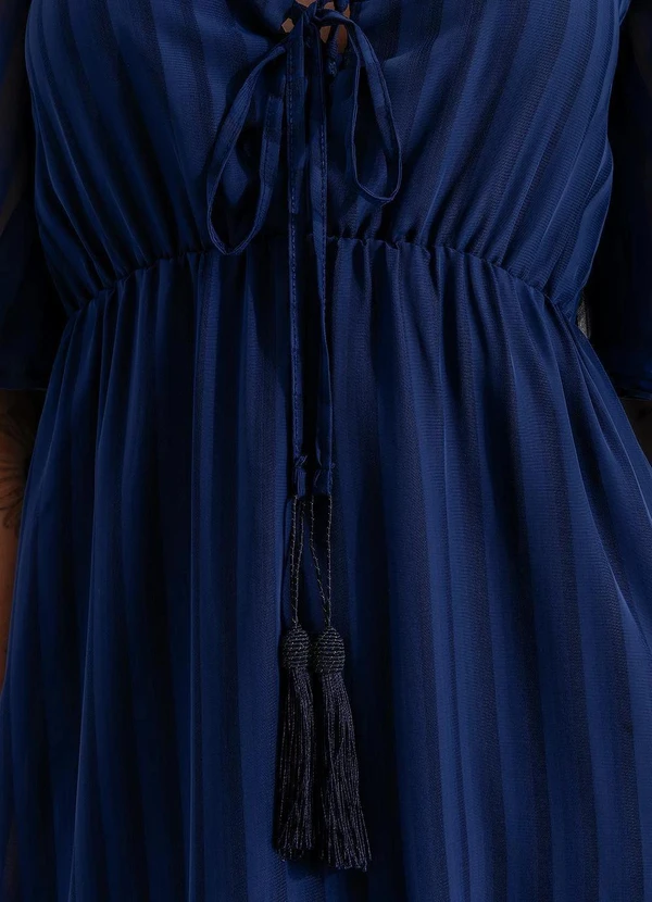 Vestido feminino midi em voil de poliéster azul marinho com padronagem listrada texturizada. Uma peça versátil que combina a estética romântica com a praticidade de um tecido que mantém a elegância durante todo o dia.