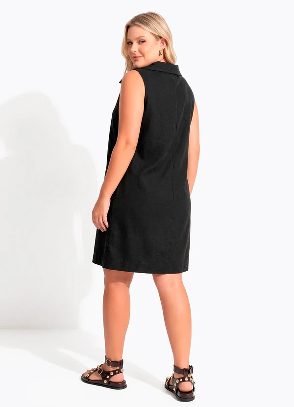 Vestido em nylon leve suede preto, modelagem reta e sem mangas. Com gola esporte, decote V profundo, recorte central e bolsos laterais embutidos, une elegância e conforto em um clássico versátil para várias ocasiões.